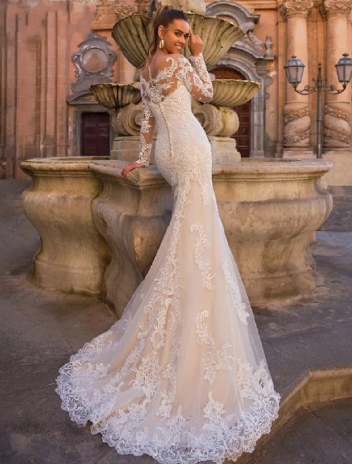 Engagement Formal Fall Wedding Dresses Two Piece Sweetheart Long Sleeve Court Train Lace Outdoor Bridal Gowns With Appliques - US 2 / UK 6 / EU 32