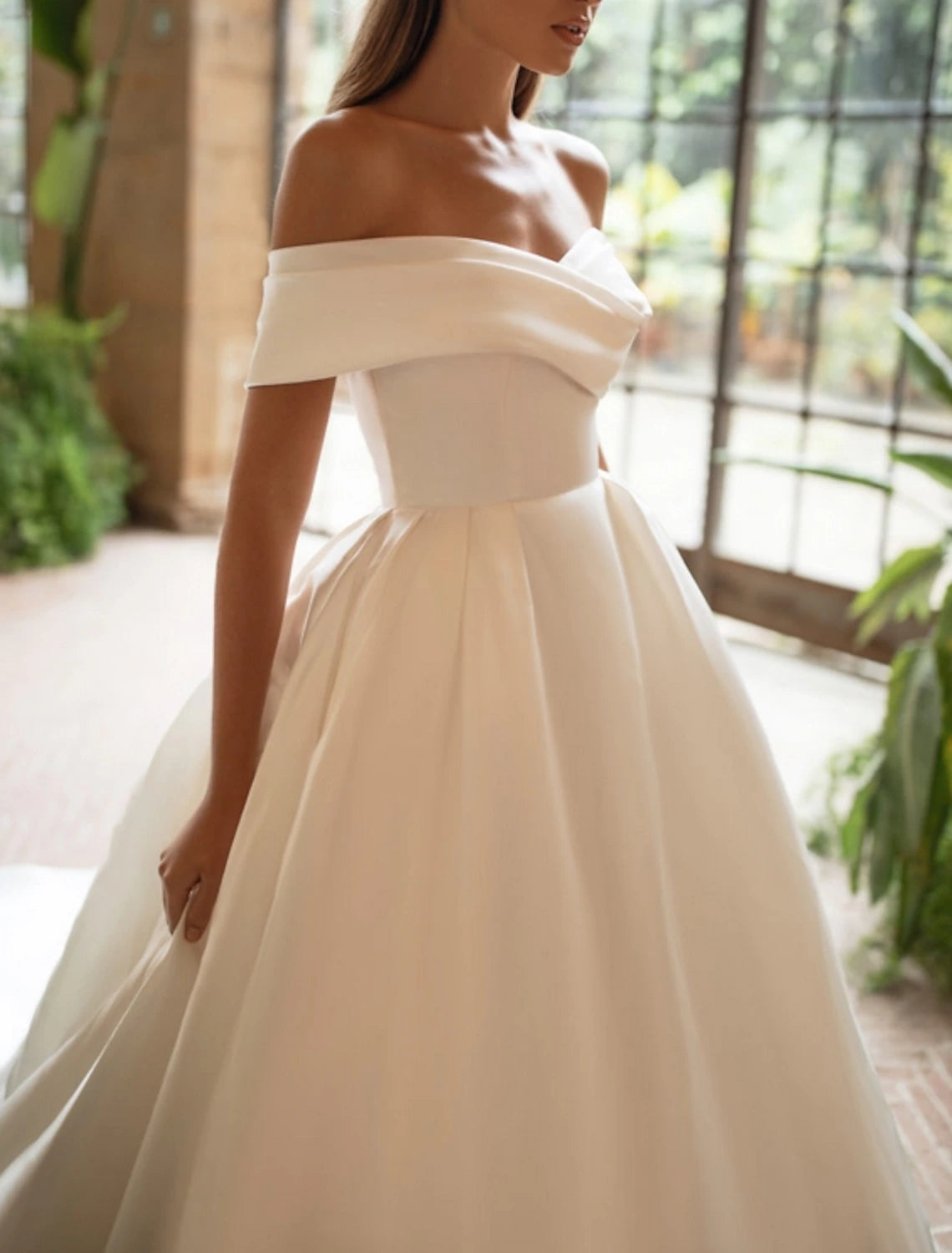 Engagement Formal Wedding Dresses Ball Gown Off Shoulder Cap Sleeve Court Train Satin Bridal Gowns With Ruched - US 2 / UK 6 / EU 32