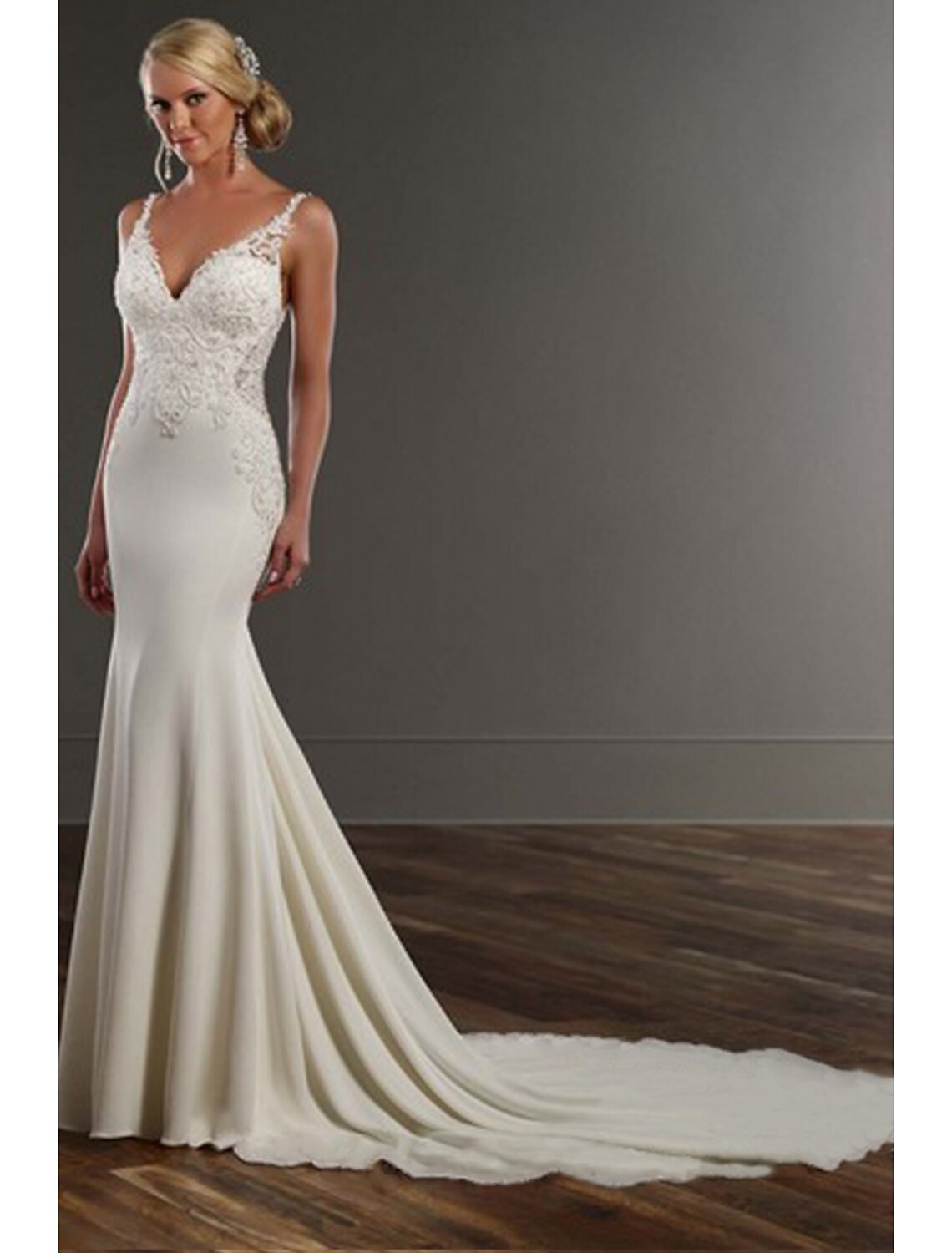 Engagement Open Back Sexy Formal Wedding Dresses Mermaid / Trumpet V Neck Sleeveless Chapel Train Lace Bridal Gowns With Appliques - US 2 / UK 6 / EU 32