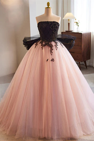 Glamorous Strapless Applique Pink-Black Floor-Length Wedding Dress