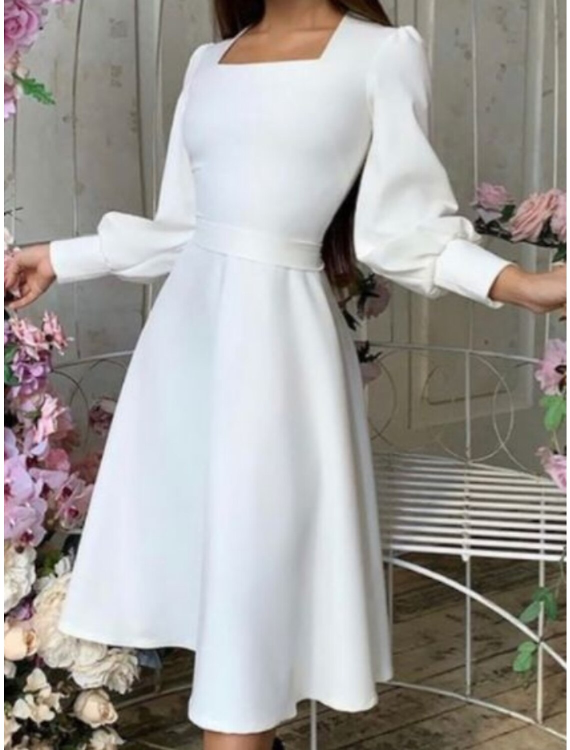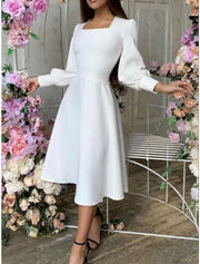 Little White Dresses Wedding Dresses A-Line Square Neck Long Sleeve Tea Length Satin Bridal Gowns With Pleats Solid Color - US 2 / UK 6 / EU 32