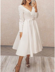 Little White Dresses Wedding Dresses A-Line V Neck Long Sleeve Tea Length Satin Bridal Gowns With Pleats Solid Color