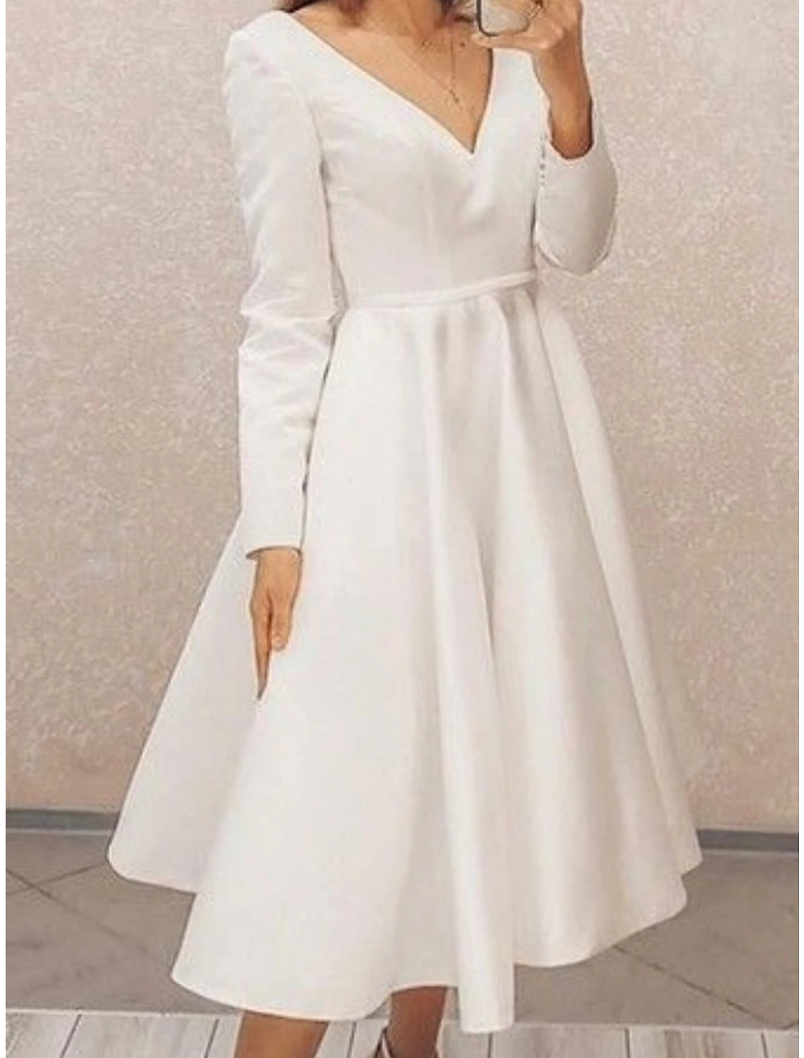 Little White Dresses Wedding Dresses A-Line V Neck Long Sleeve Tea Length Satin Bridal Gowns With Pleats Solid Color - US 2 / UK 6 / EU 32