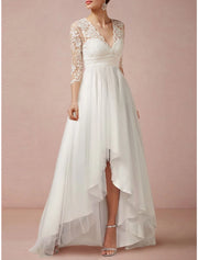 Mature Wedding Dresses Sheath / Column V Neck 3/4 Length Sleeve Asymmetrical Chiffon Bridal Gowns With Pleats Ruched - US 2 / UK 6 / EU 32