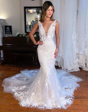 Mermaid Appliques V Neck Train Wedding Dress - US 2 / UK 6 / EU 32
