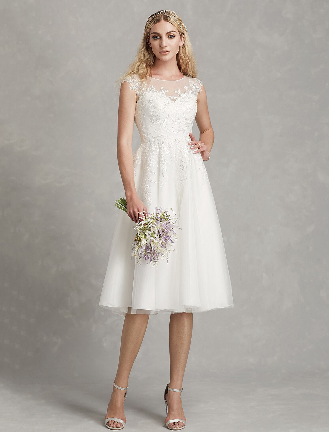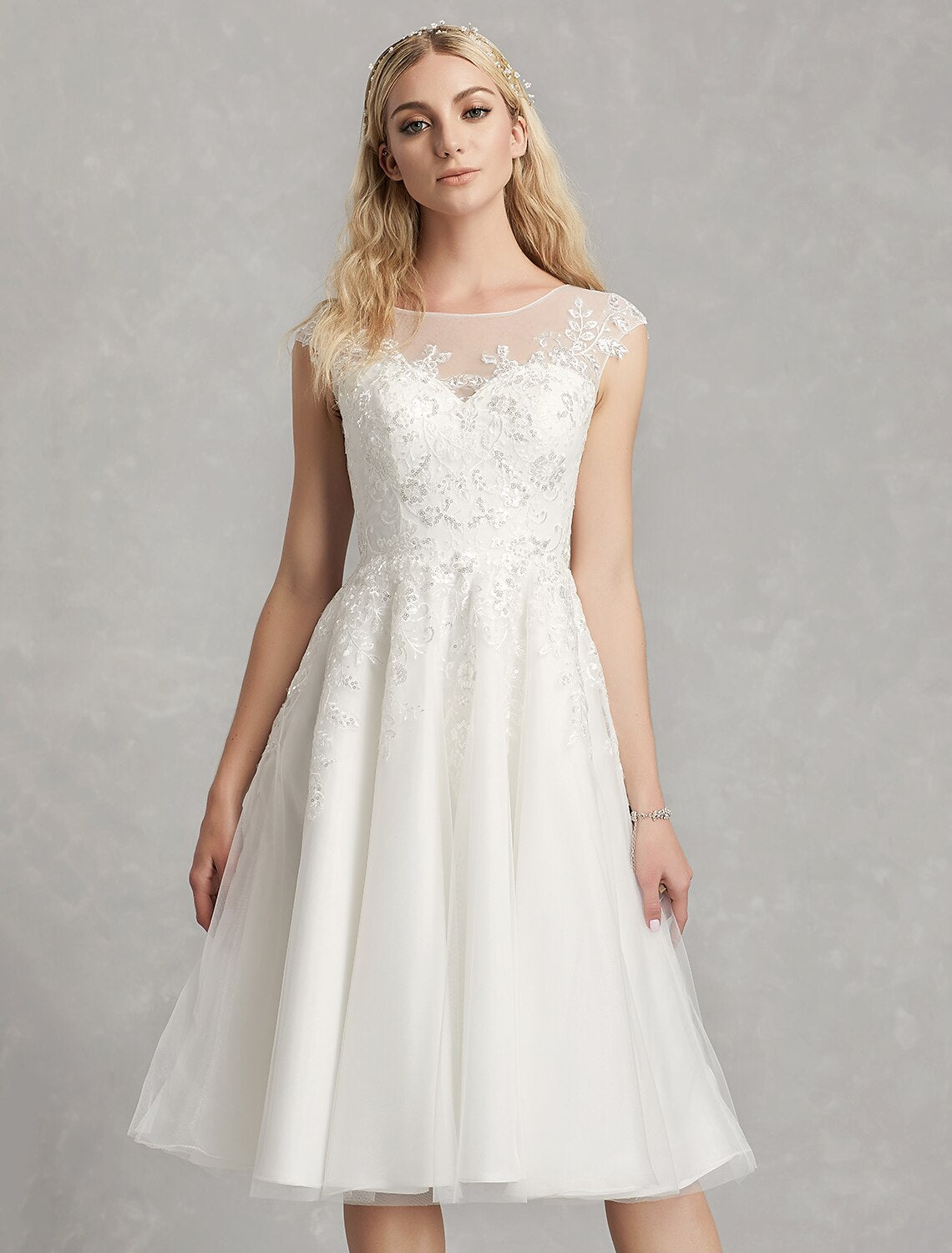 Reception Little White Dresses Wedding Dresses A-Line Illusion Neck Cap Sleeve Knee Length Lace Bridal Gowns With Appliques - US 2 / UK 6 / EU 32