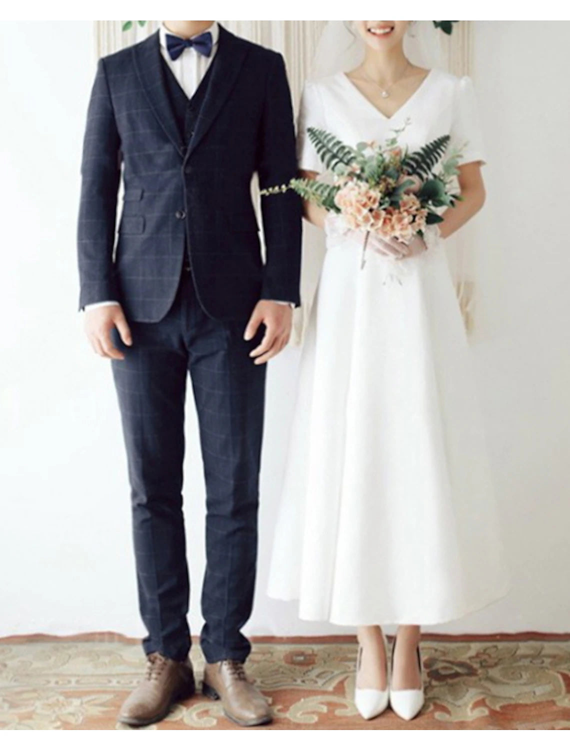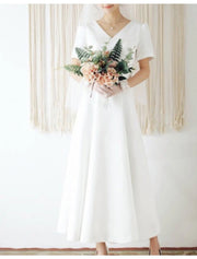 Reception Little White Dresses Wedding Dresses A-Line V Neck Short Sleeve Ankle Length Satin Bridal Gowns With Pleats