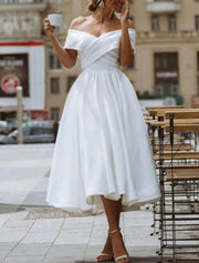 Reception Wedding Dresse Vintage Little White Dressess A-Line Off Shoulder Cap Sleeve Tea Length Satin Bridal Gowns With Pleats Summer Fall Wedding Party