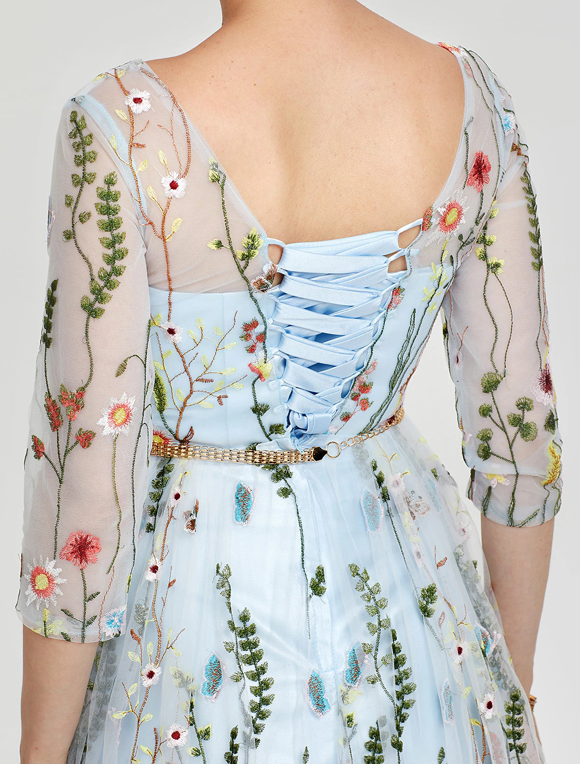 A-Line Empire Dress Wedding Guest Party Wear Floor Length 3/4 Length Sleeve Illusion Neck Lace with Embroidery Appliques - US 2 / UK 6 / EU 32