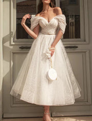 A-Line Cocktail Black Dress Vintage Dress Graduation Wedding Guest Tea Length Short Sleeve Off Shoulder Sequined with Sash / Ribbon Ruched Sequin