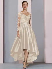 A-Line Mother of the Bride Dress Wedding Guest Elegant High Low Scoop Neck Asymmetrical Tea Length Satin Lace Long Sleeve with Pleats Beading Appliques - Champagne / US 2 / UK 6 / EU 32