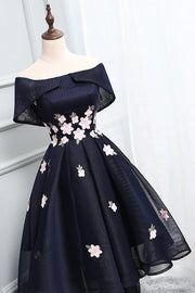 Romantic A-Line Off-the-Shoulder Floral Navy Hi-Low Homecoming Dress