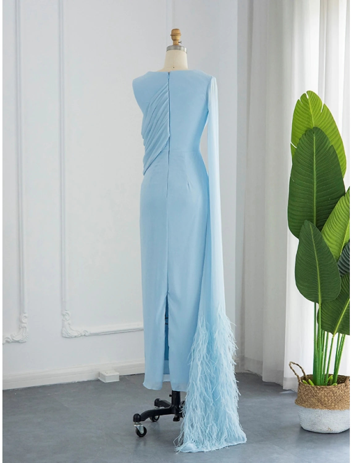 Sheath / Column Evening Gown Elegant Dress Formal Fall Sweep / Brush Train Sleeveless Cowl Neck Chiffon with Feather Ruched Slit